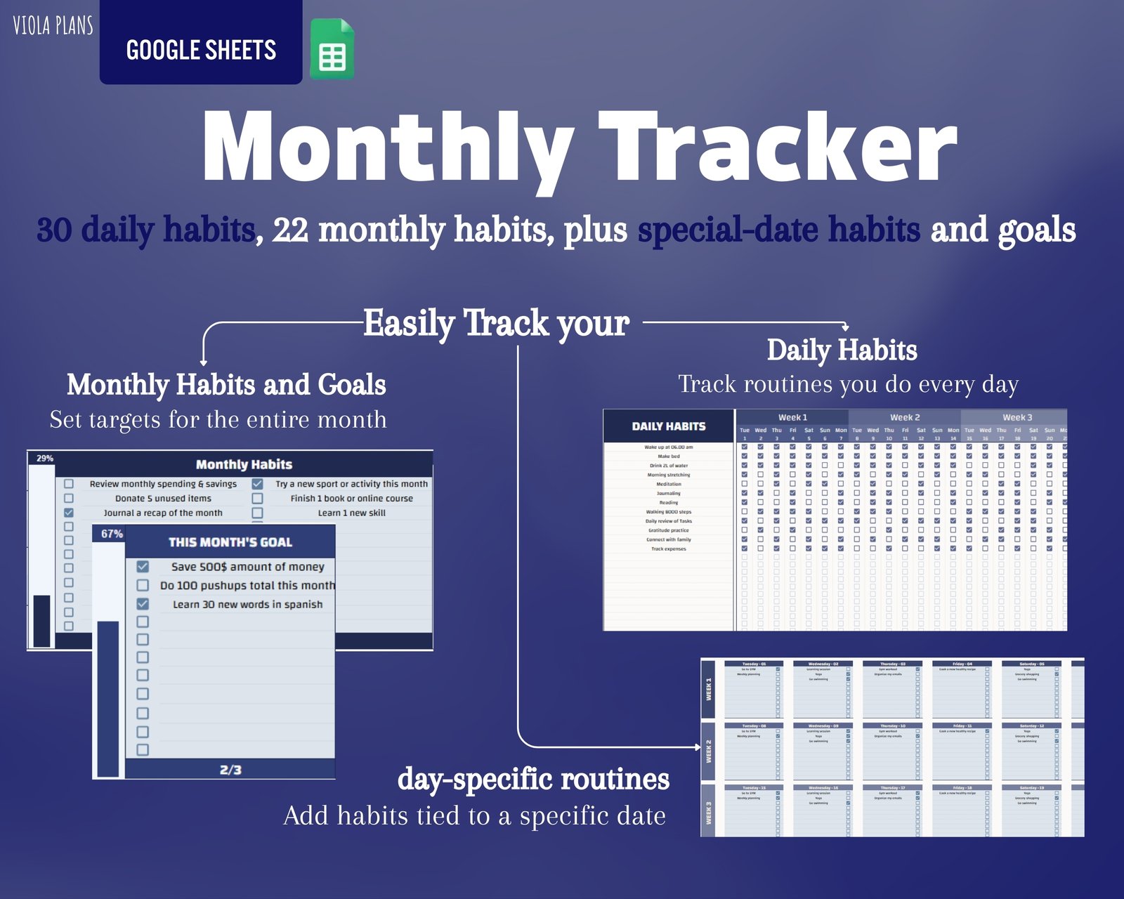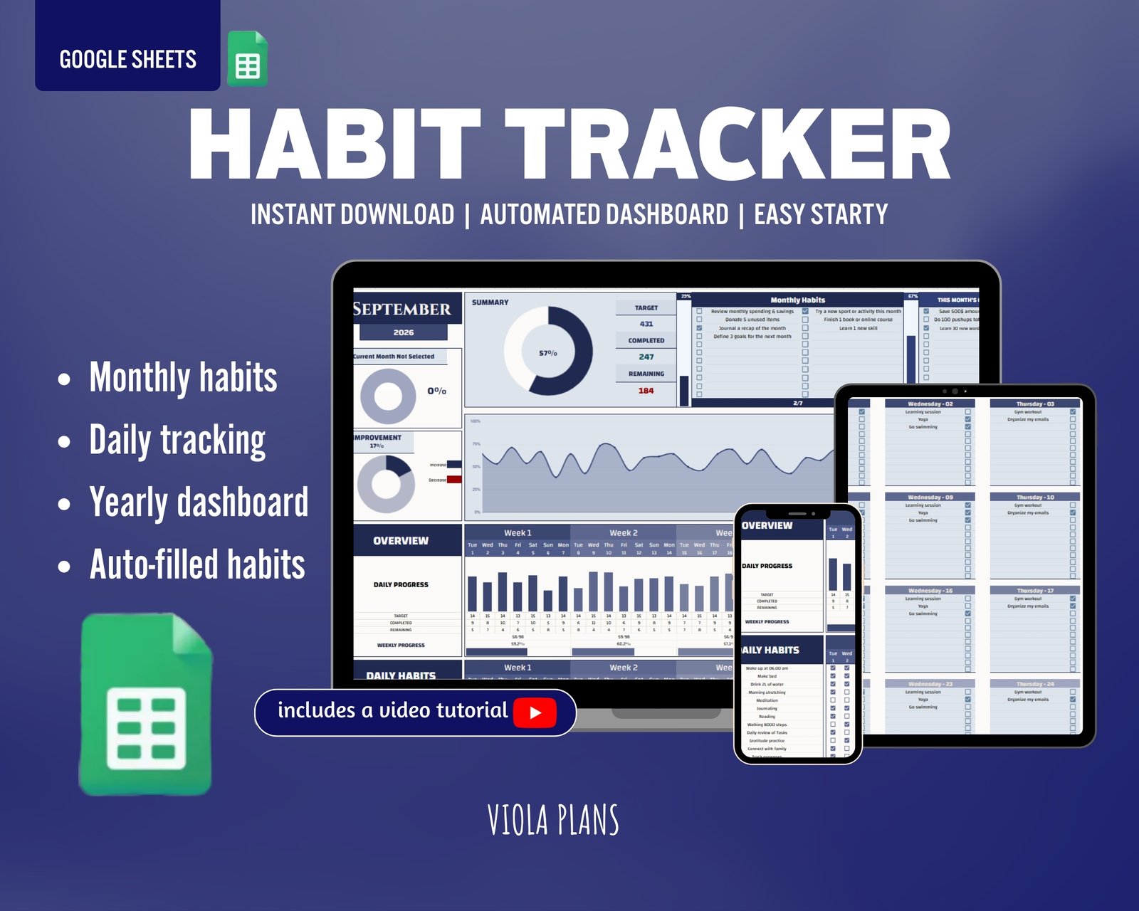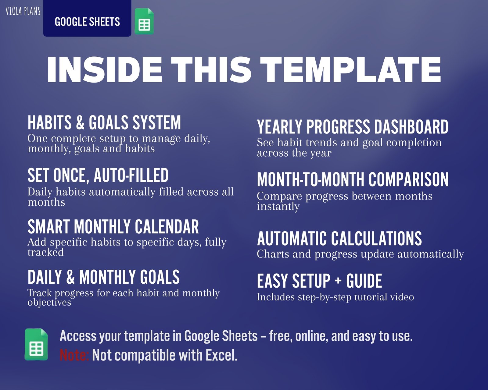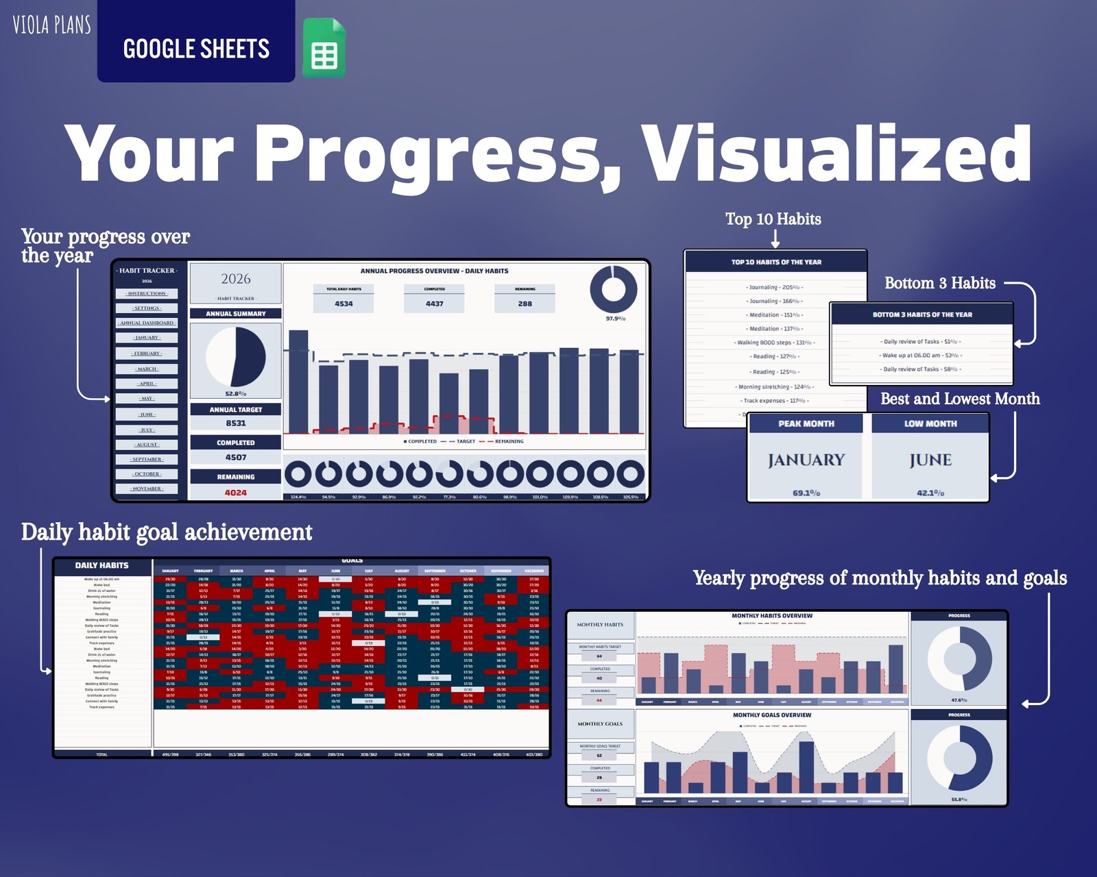 Take control of your year and finally make your habits stick with this comprehensive, all-in-one spreadsheet! Designed to provide powerful analytics, stunning visualizations, and effortless tracking, this tracker is your secret weapon for achieving your annual goals.